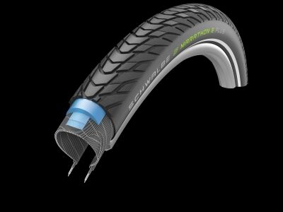UNPLATTBAR SPEZIELL FÜR E-BIKES. Maximale Fahrsicherheit bei hohen Geschwindigkeiten und auf langen Touren. Höchste Marathon-Qualität, weiterentwickelt für die speziellen Anforderungen, die an einen E-Bike Reifen gestellt werden. SICHERHEIT: Schwalbe Pannenschutz Level 7. Die patentierte SmartGuard Einlage wird zusätzlich unterstützt durch zwei Lagen RaceGuard-Gewebe. Dieser "Smart-DualGuard" schützt noch besser gegen spitze Eindringlinge. KONTROLLE: Das für den E-Einsatz konzipierte ADDIX-E Compound steht für herausragenden Grip auch bei hohen Geschwindigkeiten und ein Maximum an Haltbarkeit. FAHRFREUDE: Marathon E-Plus rollt dank High-Tech Materialeinsatz erstaunlich leicht. Die "Anti-Aging"-Seitenwand erträgt die typischen Überlastungen durch zu geringen Luftdruck deutlich länger, bevor sie hässliche Risse bekommt. Der neue Karkassen-Aufbau verstärkt die Seitenwände um eine weitere Gewebelage und stabilisiert dadurch den Reifen für noch mehr Traglast. DESIGN: Modern und dynamisch ist das Profildesign des E-Plus. Mit tieferem Profil, äußerst vielseitig für den Touren- und Trekkingbereich. E-BIKE: Selbstverständlich ist der neue Marathon E-Plus ECE-R75 zertifiziert und ebenso bereit für Pedelcs mit einer Trittunterstützung bis 25 km/h als auch S-Pedelecs. Die verfügbaren Größen orientieren sich konsequent an den Anforderungen modernster E-Bikes.
